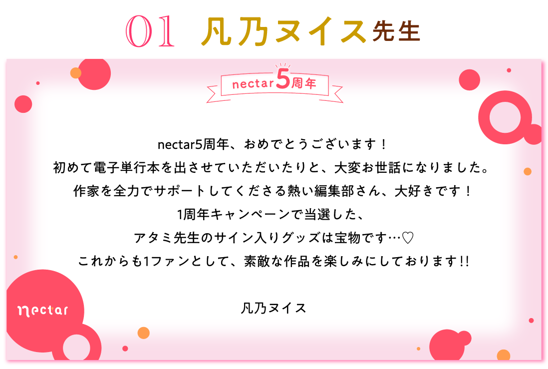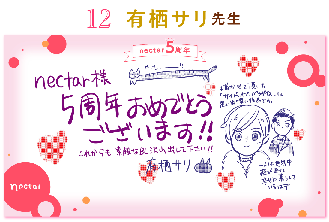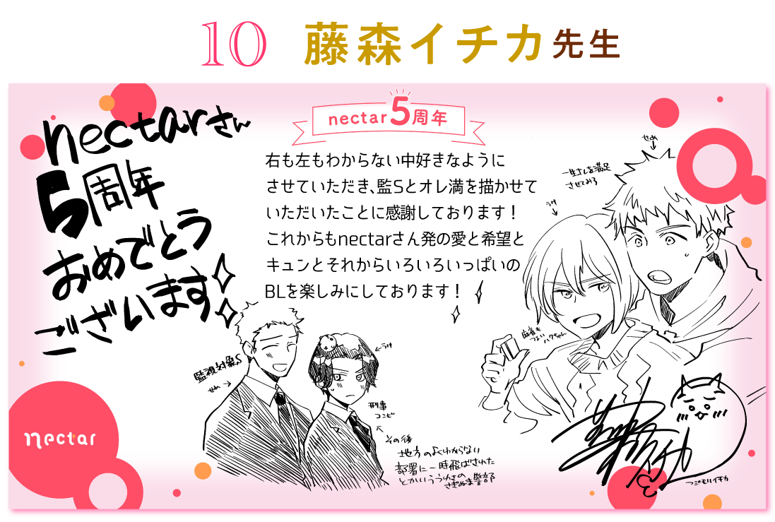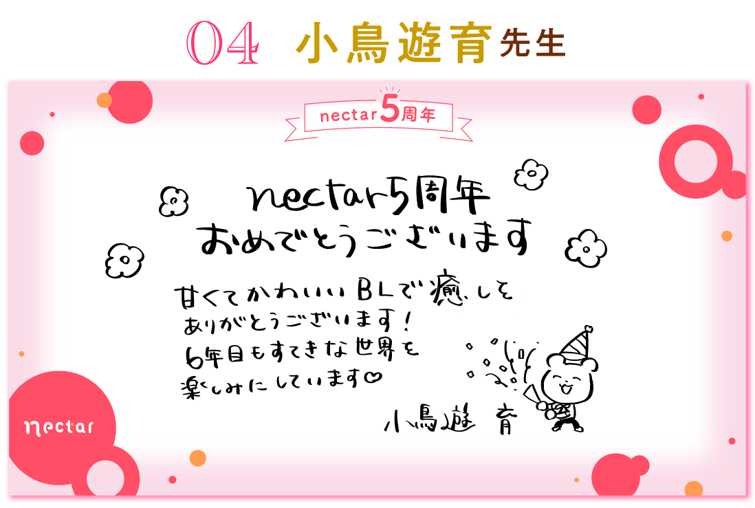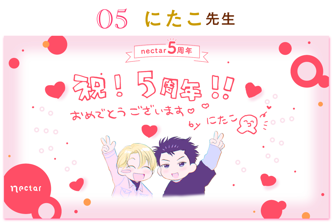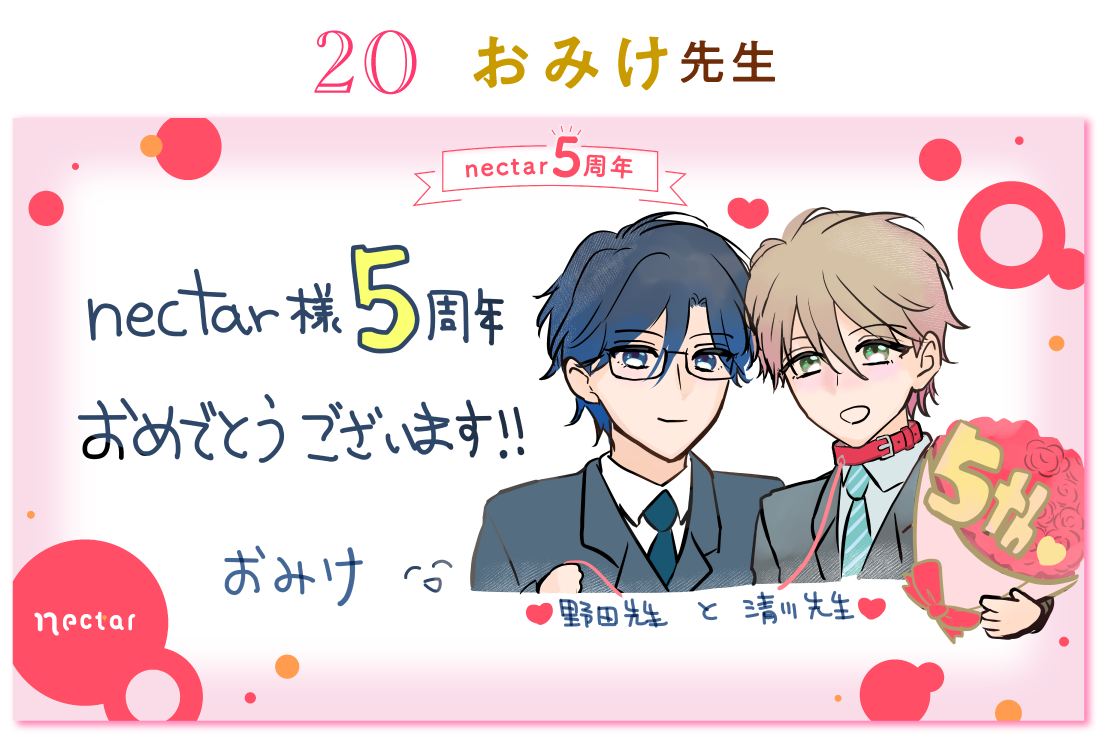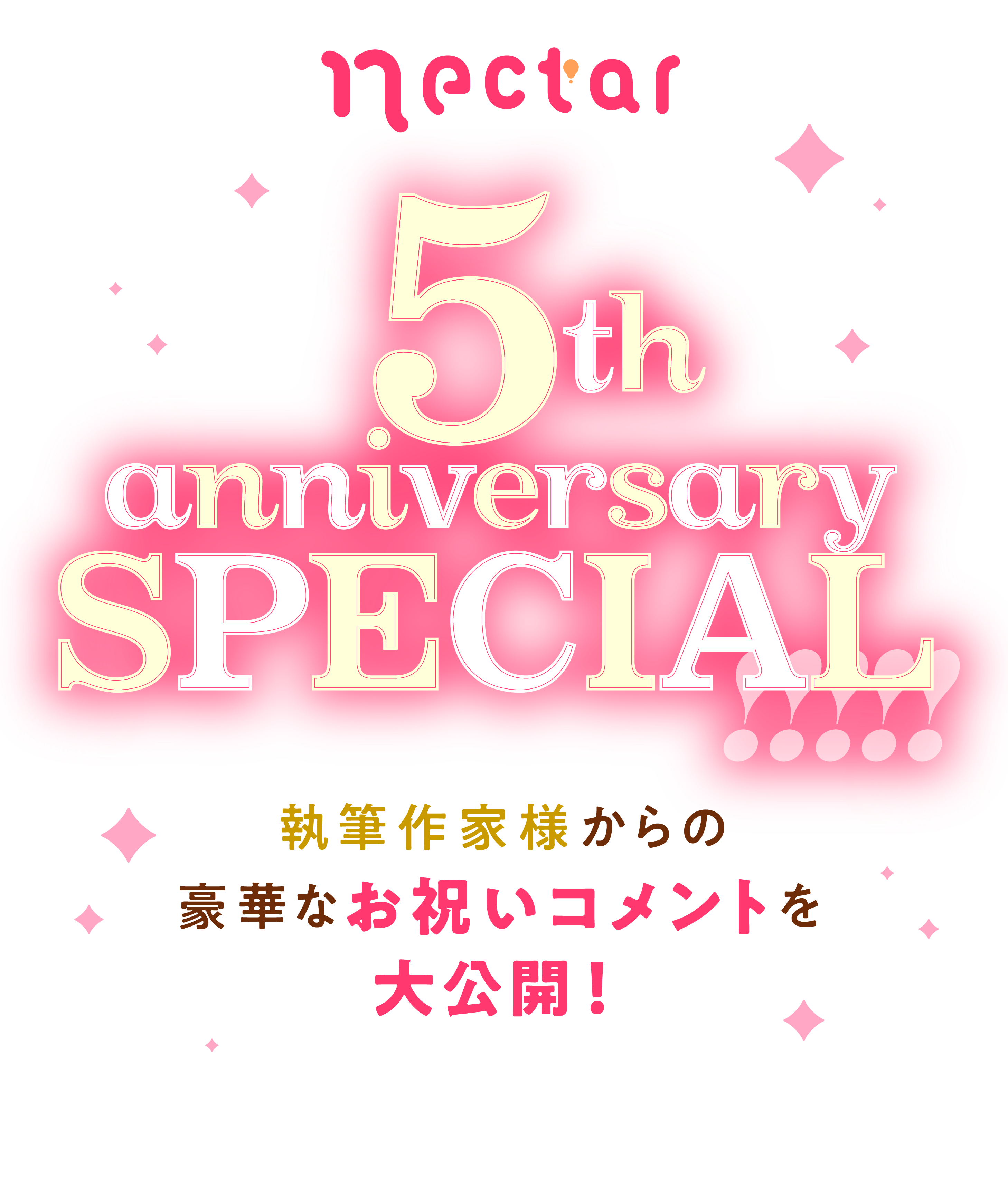 “とろけるほどに甘いセカイで溺れたい” をモットーにオープンした宣伝サイト、 nectarが5周年を迎えました。 それを記念して、執筆作家様からいただいた 豪華なお祝いメッセージを大公開! 今後ともnectarをよろしくお願いいたします。