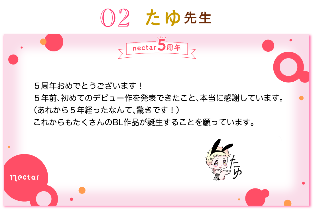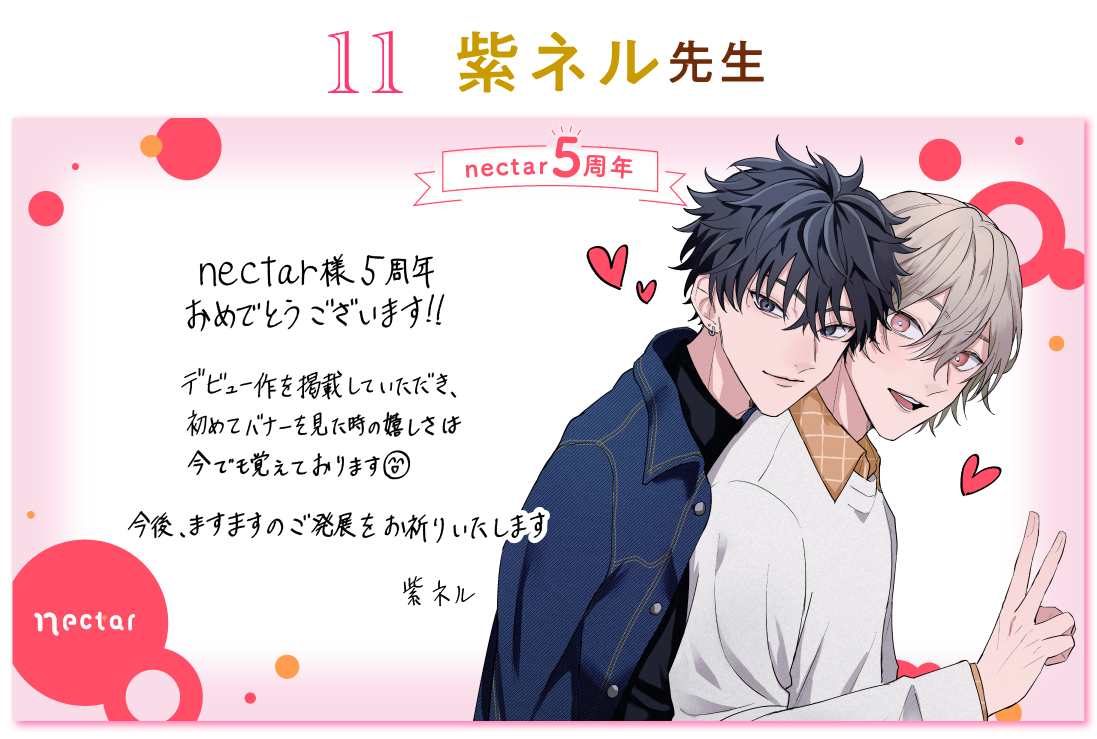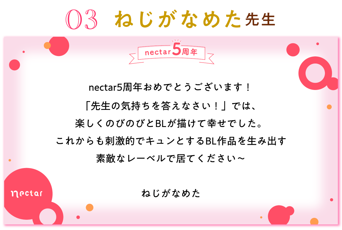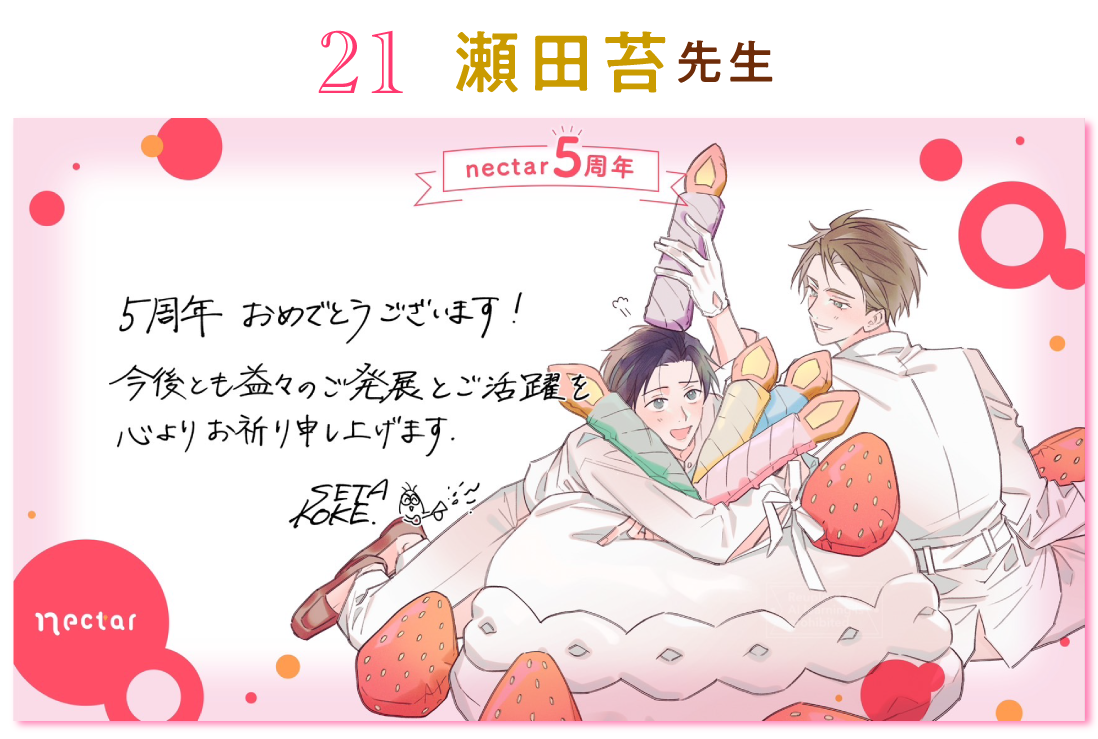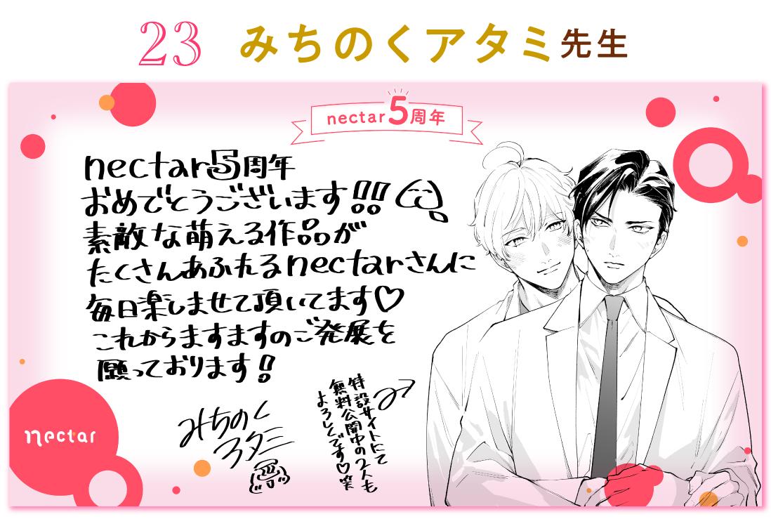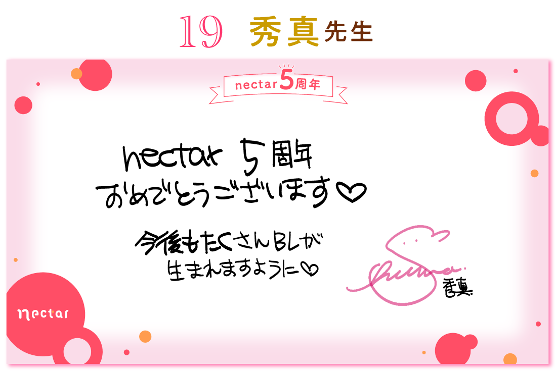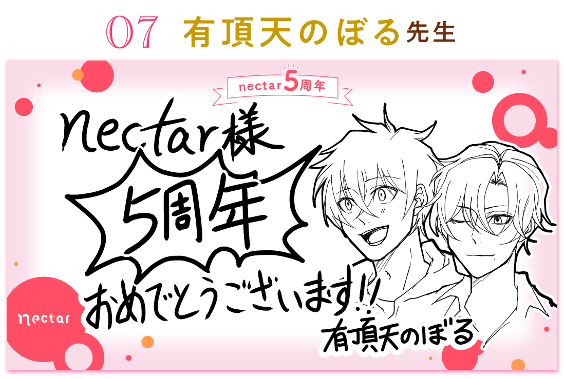 “とろけるほどに甘いセカイで溺れたい” をモットーにオープンした宣伝サイト、 nectarが5周年を迎えました。 それを記念して、執筆作家様からいただいた 豪華なお祝いメッセージを大公開! 今後ともnectarをよろしくお願いいたします。