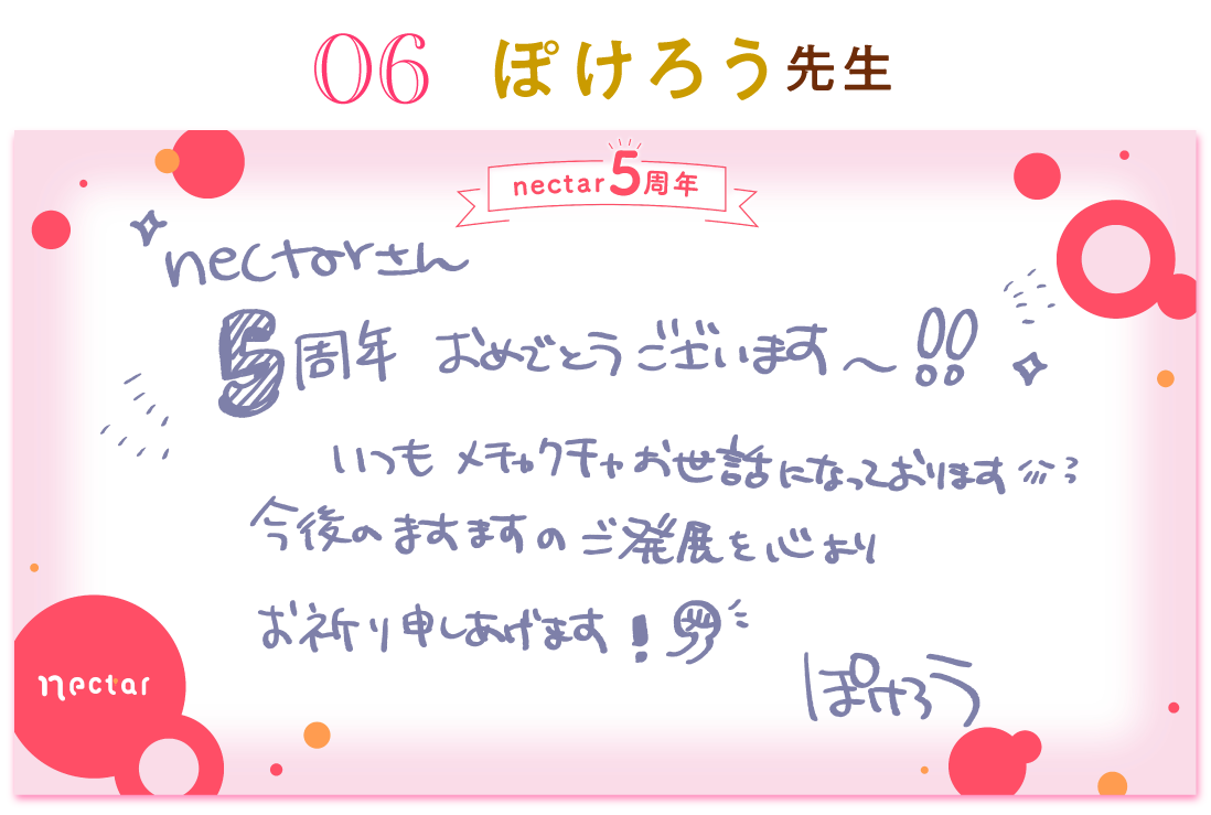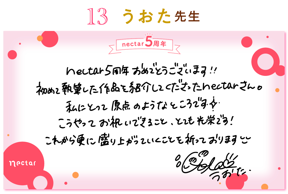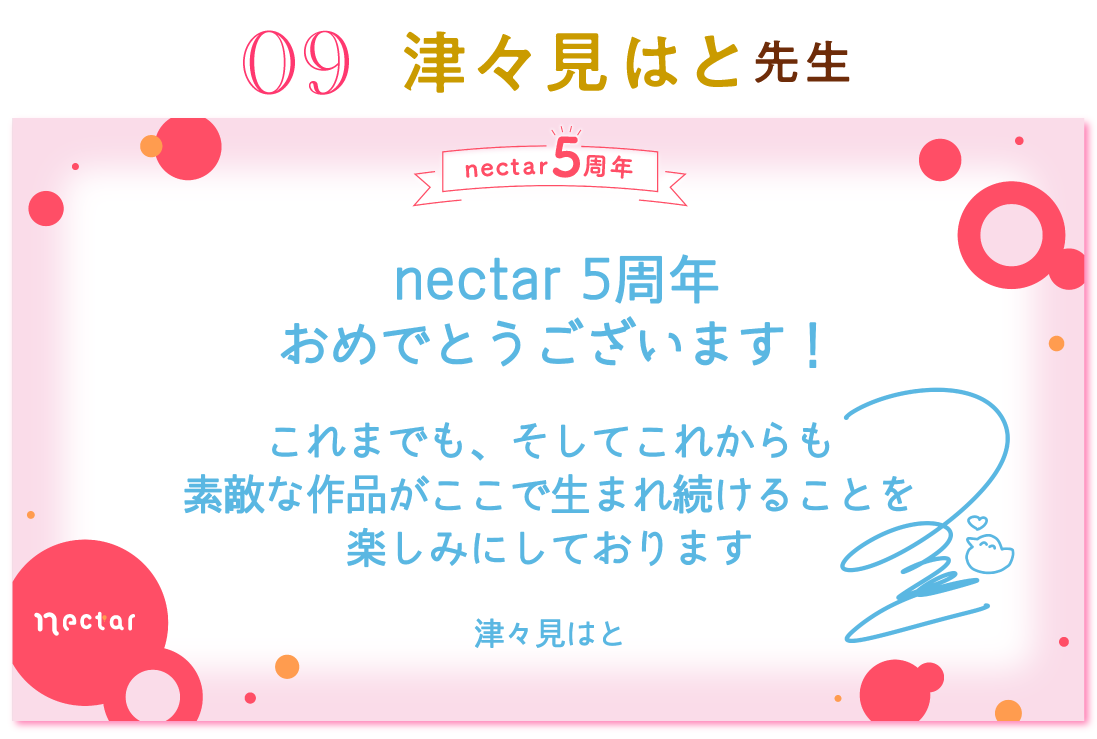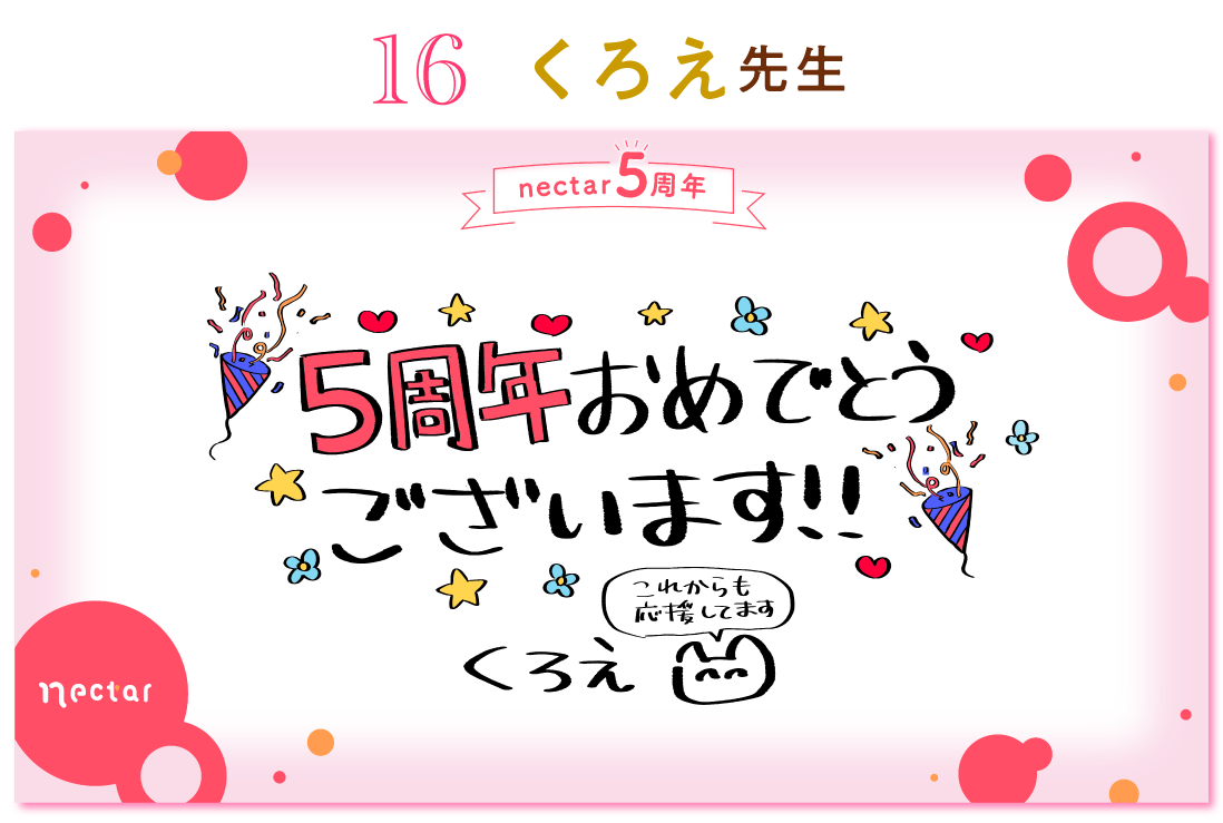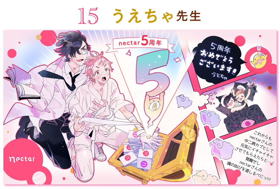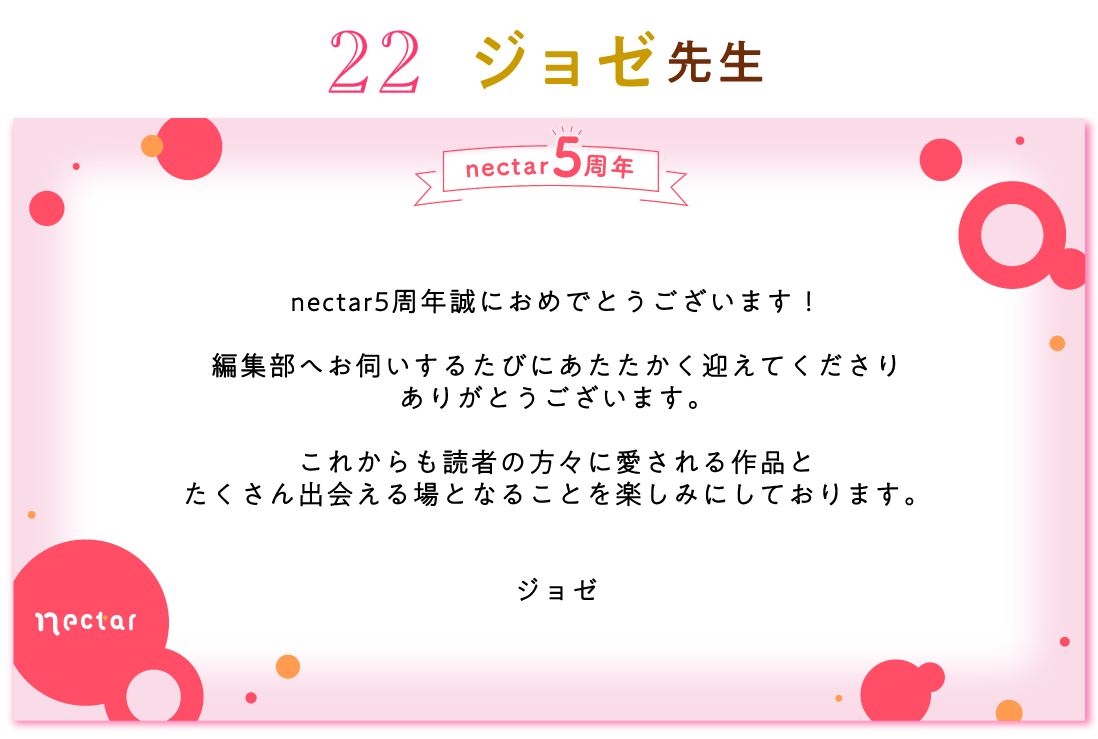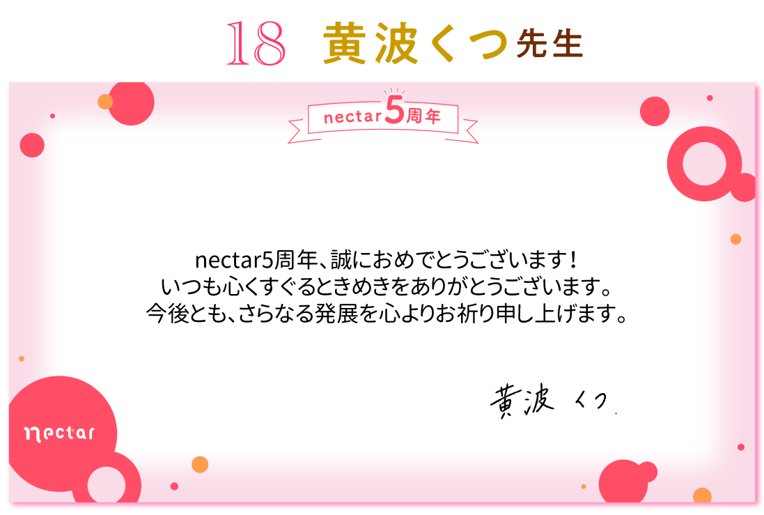 “とろけるほどに甘いセカイで溺れたい” をモットーにオープンした宣伝サイト、 nectarが5周年を迎えました。 それを記念して、執筆作家様からいただいた 豪華なお祝いメッセージを大公開! 今後ともnectarをよろしくお願いいたします。